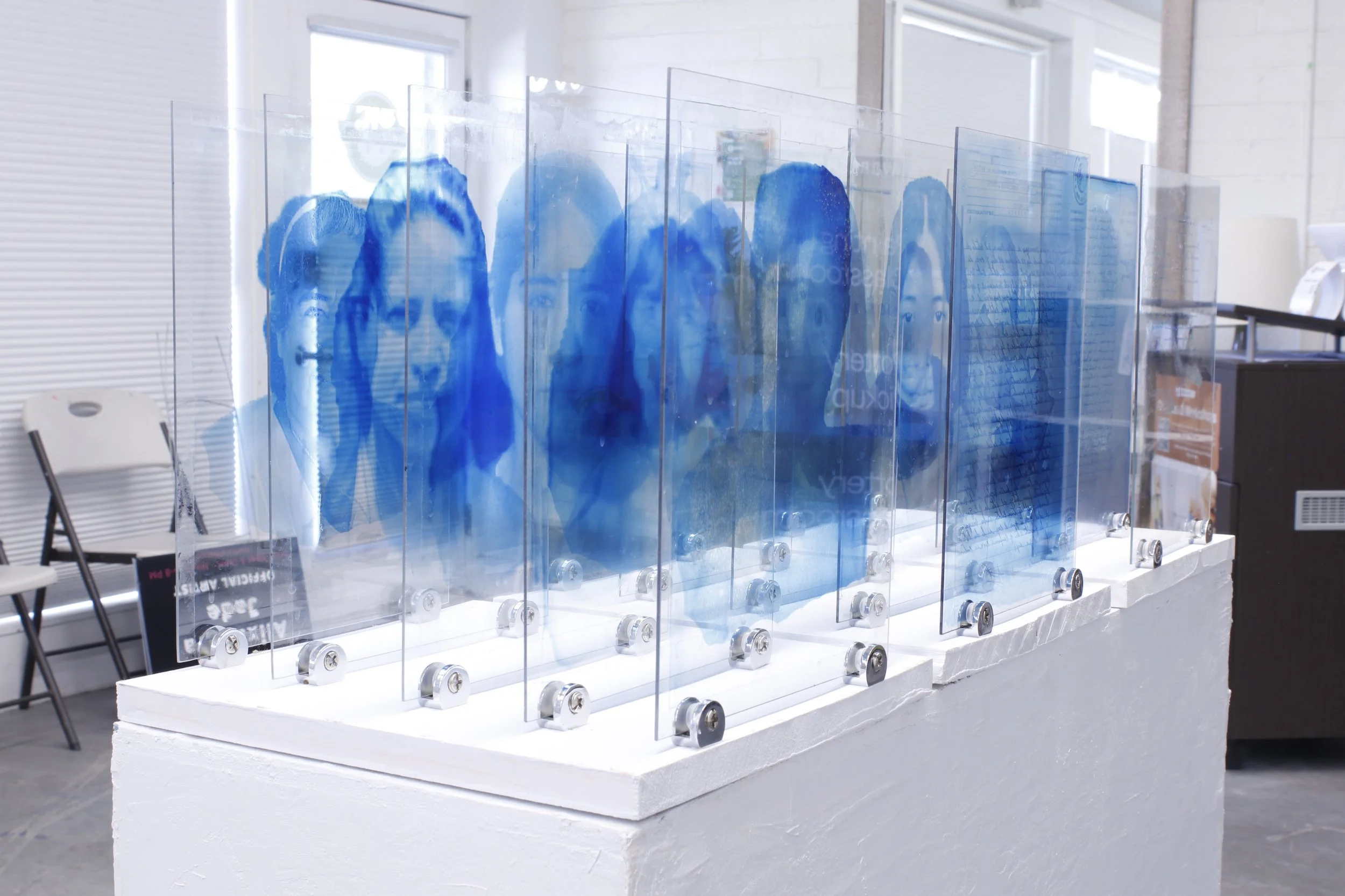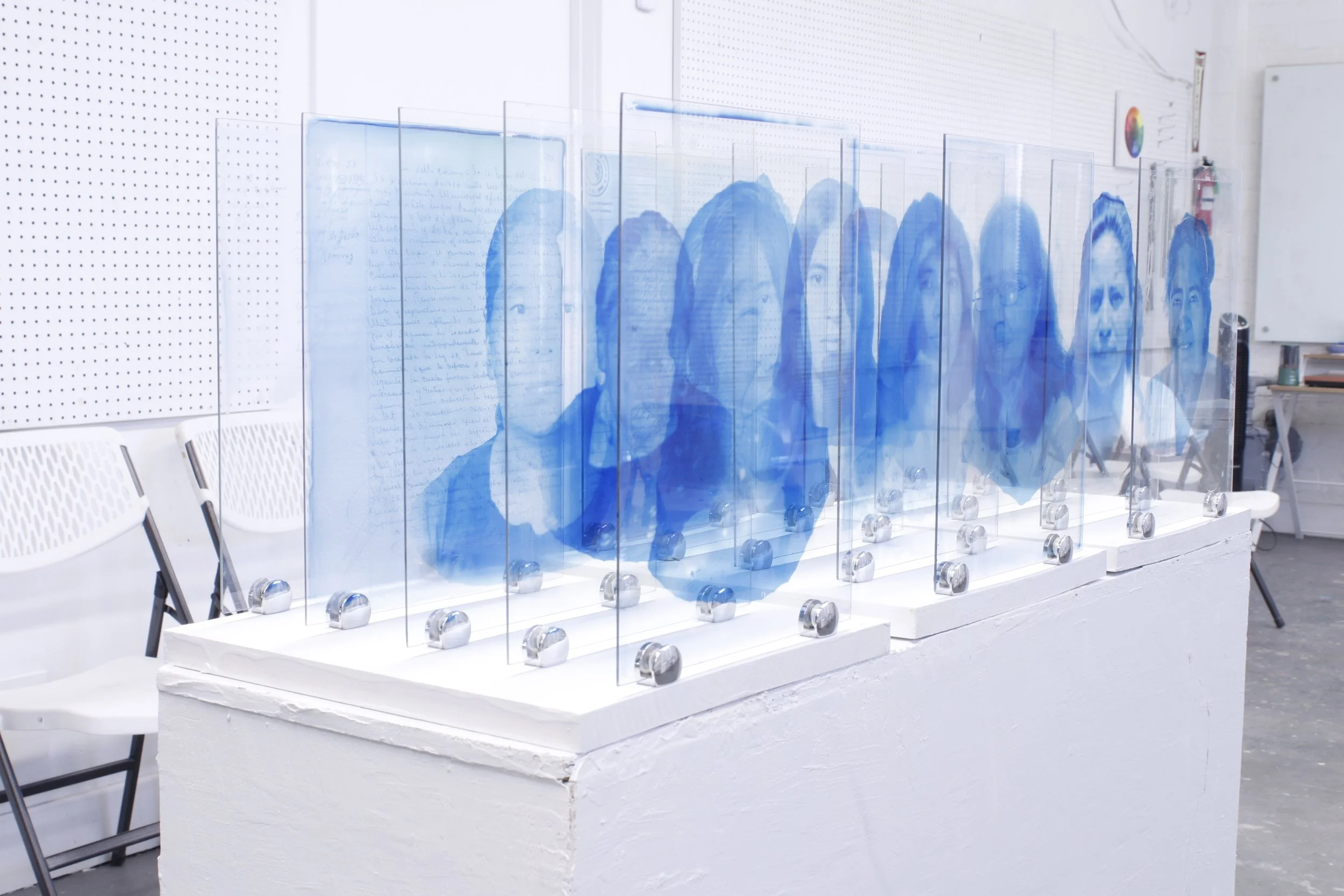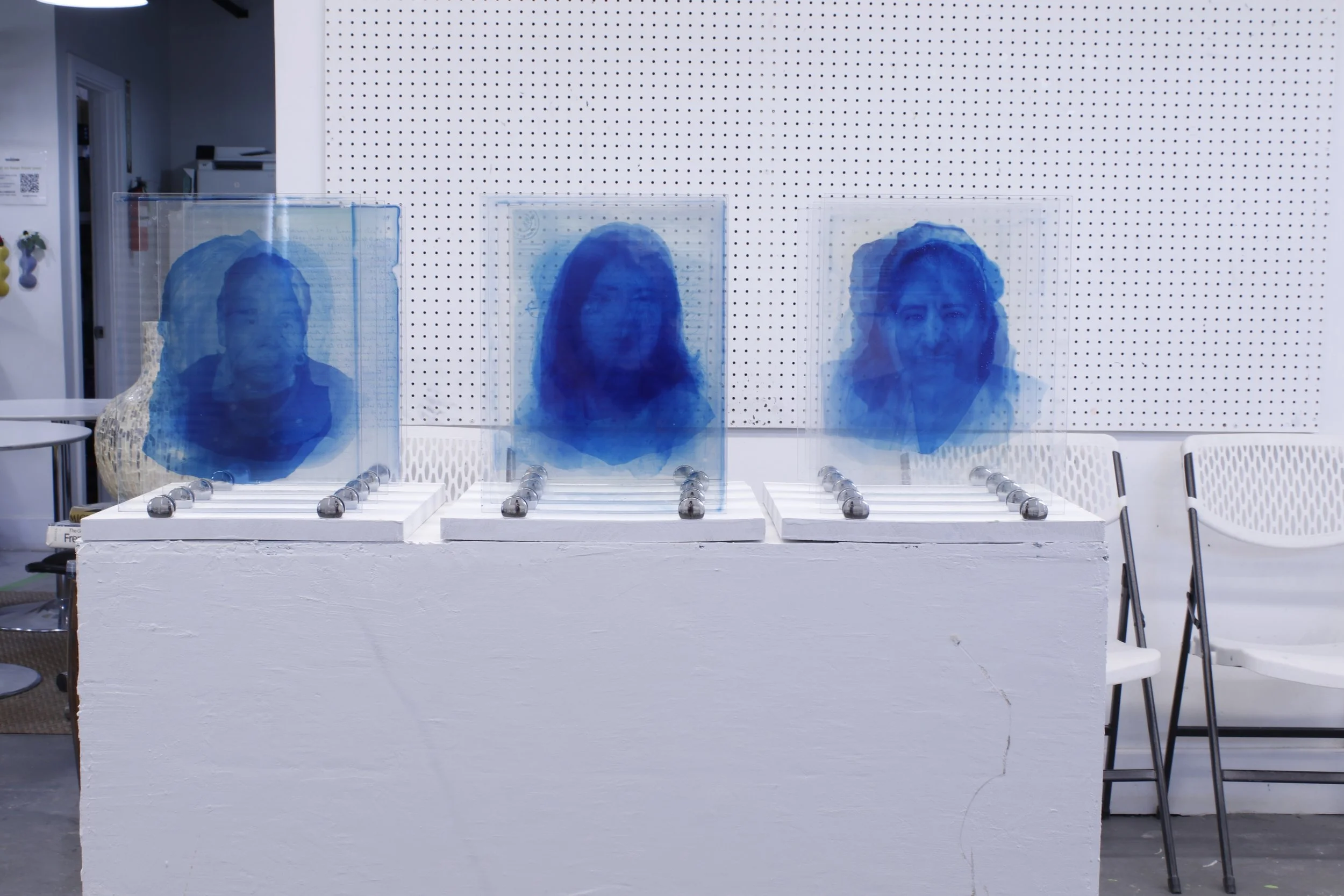 Inner Pillars (2023) serves as a visual metaphor. Using layered cyanotypes on glass, I depict influential women in my life. Their features obscured by my presence, a version of themselves seen, literally, through me. At the core of the work, the focus lies on the conceptual exploration of intricate layers of identity and the transformative influence of familial relationships. The smaller versions of these cyanotypes serve as echoes of each individual, with some of them missing images replaced by written records. This aspect is particularly significant for those who lack childhood images, as it fills the gaps in their childhood memories these records become a visual archive resembling how readers imagine characters in a book, creating a missing photograph in our minds. It's a contrast highlighting how younger generations now have the privilege of a comprehensive visual record of their lives. The blue of the cyanotype acts similarly to the blue we see in the sky: the closer it is to us, the darker the blue, but the closer it gets to the horizon, the lighter it becomes. This speaks to that same distance where, when you look at the work from the front, it acts the same way as the sky. This concept addresses physical distance but also the distance in time and generations, creating echoes within us.