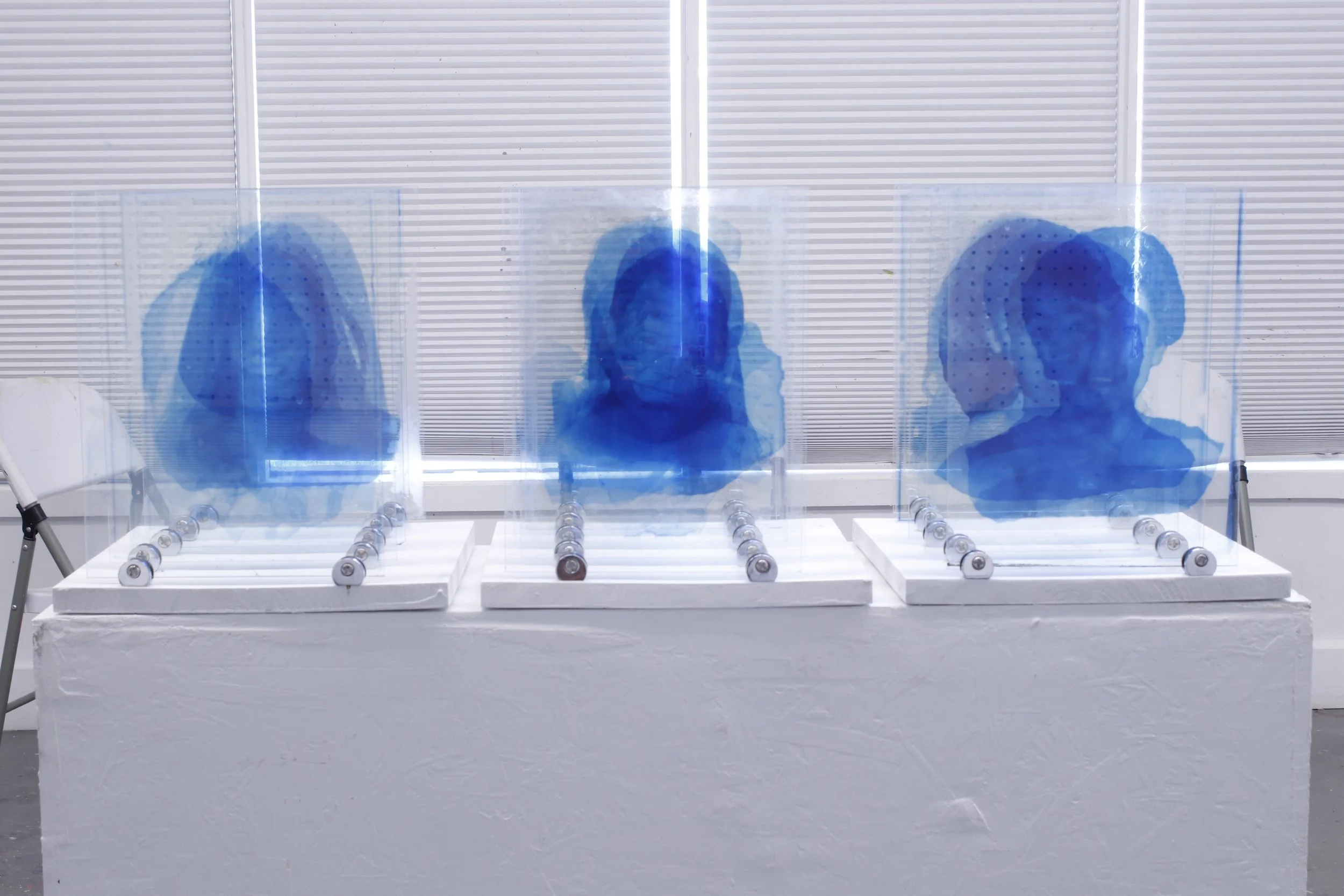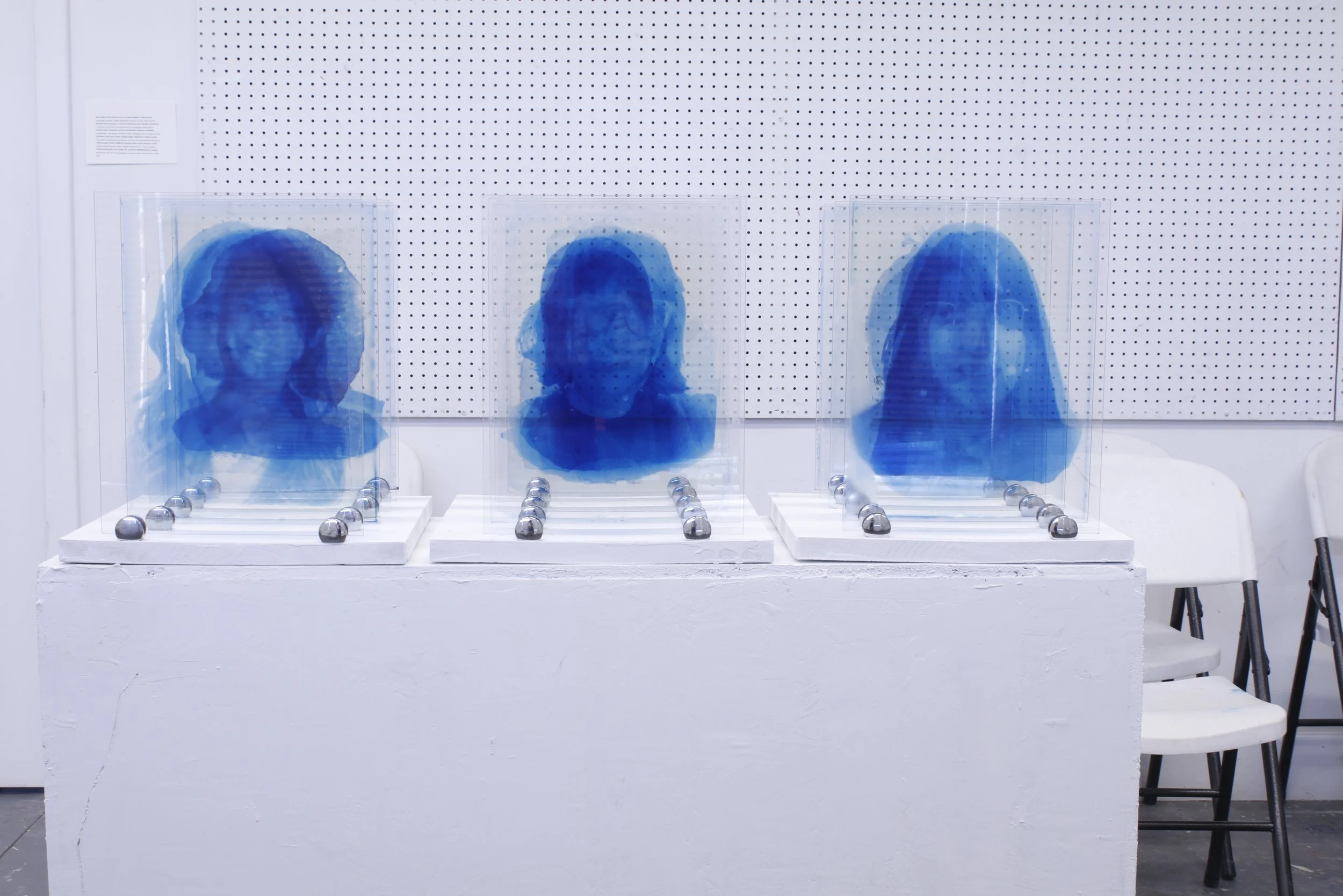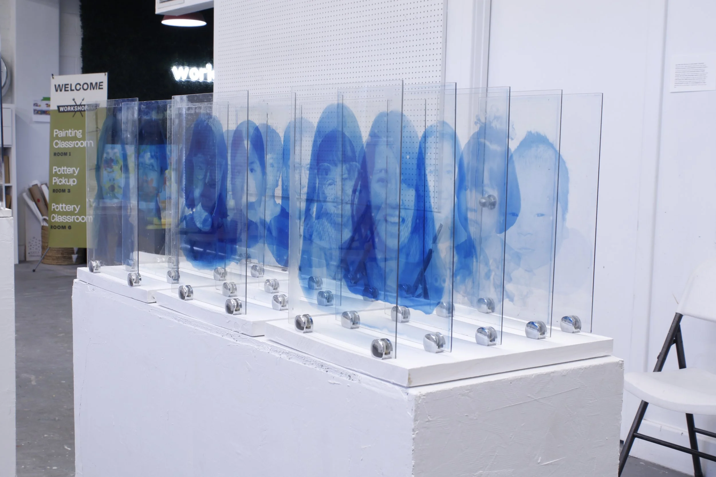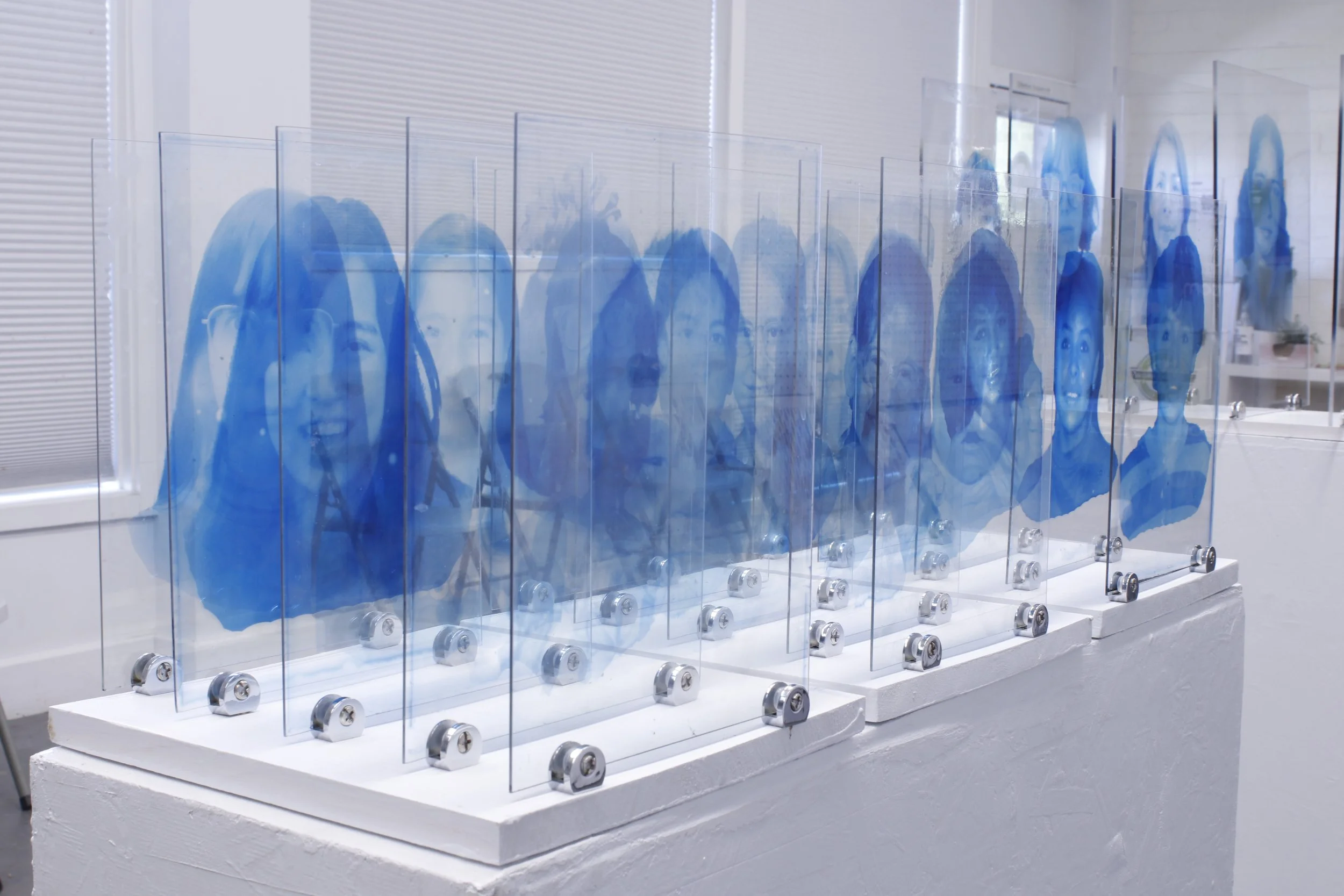 Inner Pillars (2023) serves as a visual metaphor. Using layered cyanotypes on glass, I depict influential women in my life. Their features obscured by my presence, a version of themselves seen, literally, through me. At the core of the work, the focus lies on the conceptual exploration of intricate layers of identity and the transformative influence of familial relationships. The smaller versions of these cyanotypes serve as echoes of each individual, with some of them missing images replaced by written records. This aspect is particularly significant for those who lack childhood images, as it fills the gaps in their childhood memories these records become a visual archive resembling how readers imagine characters in a book, creating a missing photograph in our minds. It's a contrast highlighting how younger generations now have the privilege of a comprehensive visual record of their lives. The blue of the cyanotype acts similarly to the blue we see in the sky: the closer it is to us, the darker the blue, but the closer it gets to the horizon, the lighter it becomes. This speaks to that same distance where, when you look at the work from the front, it acts the same way as the sky. This concept addresses physical distance but also the distance in time and generations, creating echoes within us.